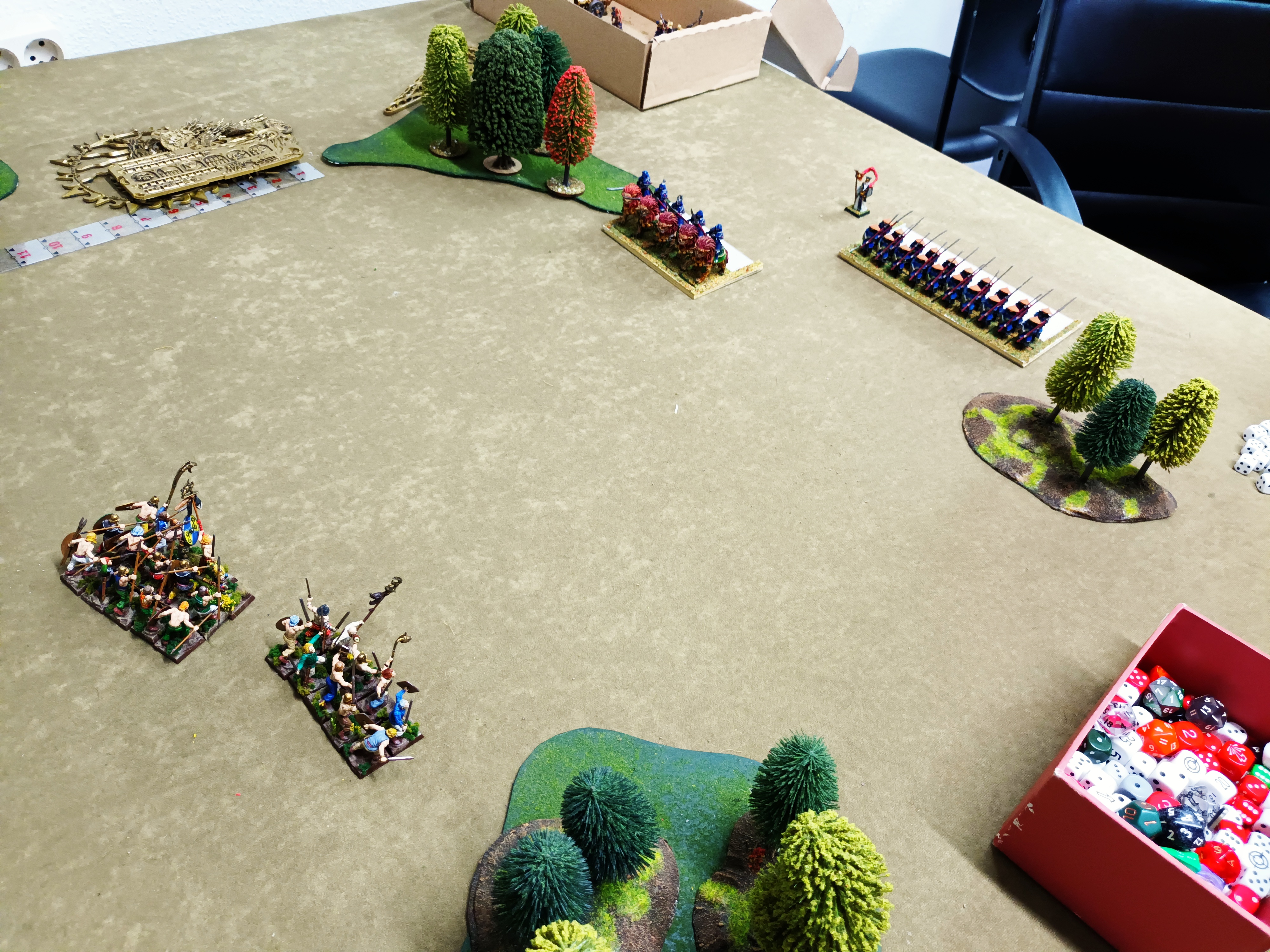 Los guerreros de Albion, esta vez no brillaron en demasía y aunque consiguieron cargar con un movimiento increíble, esa fue toda su aportación. Una maldición del mago enemigo acabó con casi la totalidad de la segunda línea de la unidad y los supervivientes fueron incapaces de causar más de una baja a los lanceros, en el contragolpe, los lanceros prácticamente arrasaron a los guerreros y todo y que aguantaron el tipo, al turno siguiente fueron barridos.
